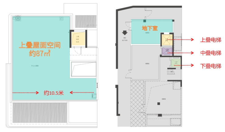上叠屋面空间:最大面积约87㎡,未来可打造为BBQ区与景观花园,实现"云端自然主义";