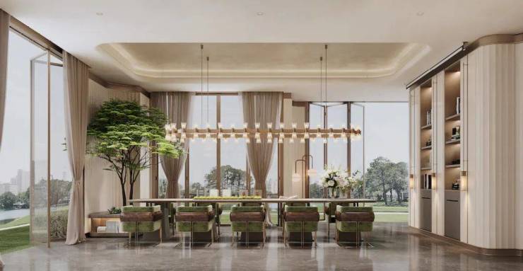 项目规划约155m²现代美学海派风奢装泛会所,四面落地窗、中央空调,地面采用拼花地砖,墙面采用浅色石材、木饰面和皮革等材质搭配,设置会客区、水吧区、聚会区,满足会客、品茗、休闲、聚会等功能,匹配菁英人群所需。