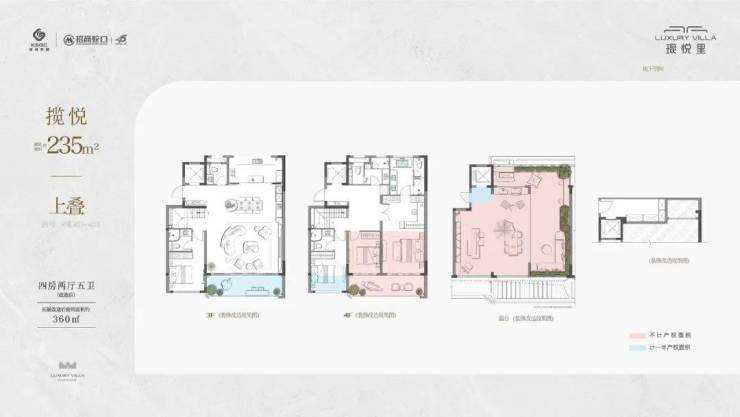 • 建筑面积约235㎡上叠,实得面积约360㎡,四房两厅五卫