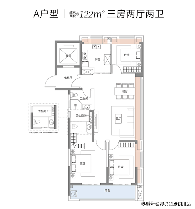 ● 122㎡三房两卫户型,也是去年四季度热销爆款,适合青睐生活享受、希望改善居住品质的业主选择。