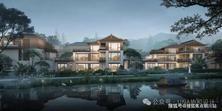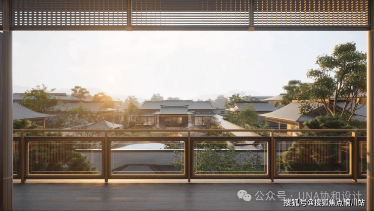 建筑以三层为主,局部两层,错落分布,疏密有致。沿中央庭院与东侧沿河区域做L形户型,充分吸纳沿河景观,实现了户户有景。利用绿植、山水、院墙的引导,形成曲折萦回的街巷空间,结合连廊、亭子、漏窗等形式,使得场景兼具观赏性与私密性。