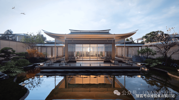 建筑立面探寻宋式美学与现代审美的结合,在抛弃繁冗的雕梁画栋后,延续宋风古朴洒脱之神韵。建筑线条简约流畅,色彩清幽雅致,具备与自然高和谐度和匹配度。