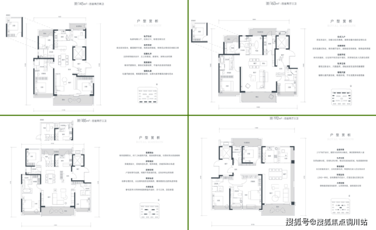 四个面积段:145-163-185-192㎡,都是四房户型。