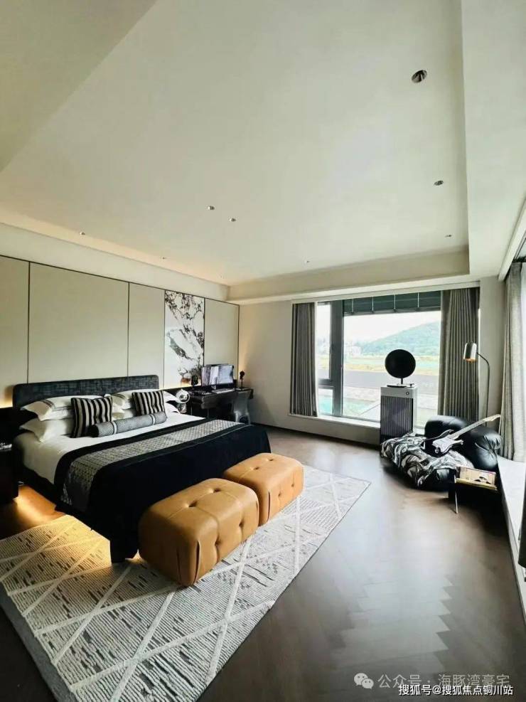 飘窗占墙面 60%,搭配白纱帘,清晨 6 点的晨光如牛奶般漫入,在木地板上织出菱形光斑;无主灯设计,照亮床头背景墙,傍晚开启时,暖光与暮色交融,给窗帘镀上一层蜜色边缘。