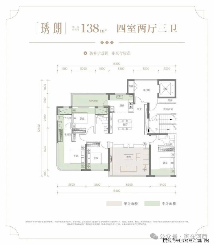 建面约138㎡户型:四房两厅三卫,约15.8米大面宽,约5.5米宽大客厅,4个卧室的面积都够大,实得面积超151平(含电梯厅),媲美以前的190平户型,牛逼!