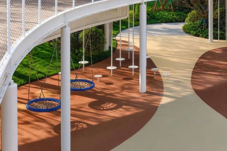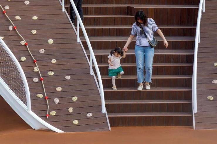 两侧的攀岩坡道,能够锻炼孩子们的勇气。成长就是不断攀爬向上的过程,累了停下歇歇也没关系,半路的风景也不错。