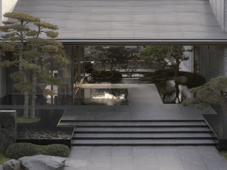 文化赋能与五感体验协同发力,深化情绪共鸣与文化认同。项目跳出传统仿古同质化误区,以南宋刘松年《四景山水图》为蓝本,邀请WTD纬图设计李卉操刀景观设计,将宋式美学核心与现代营造手法深度融合。约68米天际门仪的留白设计宛如一幅水墨画;游廊融入鄞州竹编非遗肌理,彰显出宋式“化繁为简”的美学特质。同时打造当前宁波住宅市场第一高约10米景观飞瀑,搭配松涛、瓦响构建自然白噪音环境,联动视觉、触觉、嗅觉多感官体验,构建沉浸式文化场景体系,让宋韵文化可感可触。