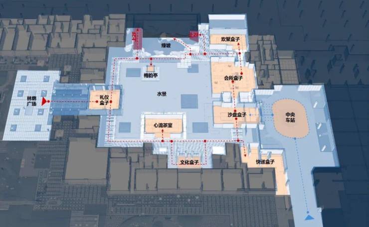 遵循传统“四水归堂”空间格局,建筑挑檐和风雨连廊环绕水院,形成了多层立体的「水景回廊」系统。不仅将沿街商业、仪式大门、各功能盒子、入户大堂串联,更镶嵌了迷人的「小尺度空间」和「林下水院」,在回廊中每一处皆是风景。