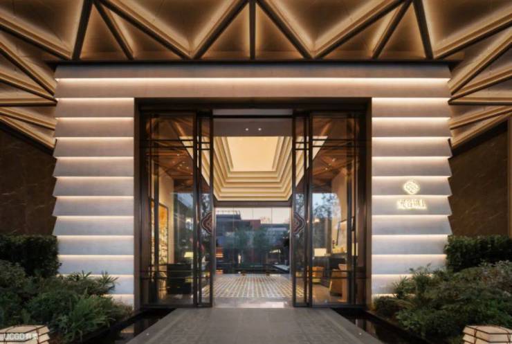 走近恢弘大门,「层叠落瓦」的立面则以月白光辉,堆叠起朗月清风的诗意。在厅内,天花重构演绎“藻井”元素,营造出一个静谧而丰富的冥想空间。