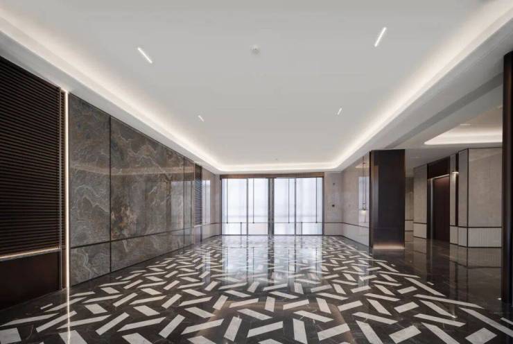 比如地下车库负一层的主车道采用全吊顶,搭配水磨石地面;又比如双入户大堂,大手笔遴选大理石景墙、拼花石材、金属屏风……全方位演绎温润与奢华。