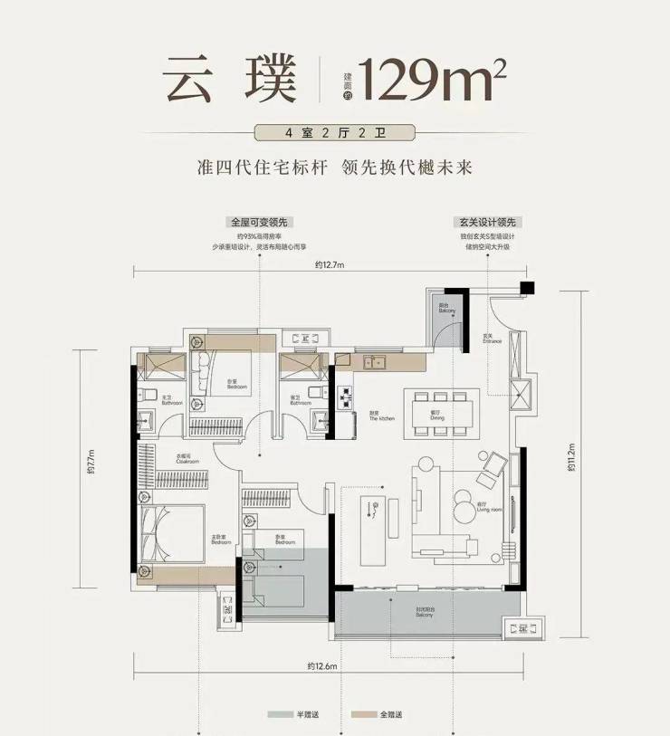 云璞户型建面约129平四室两厅两卫:此户型位于边户,南北通透,也是非常常见的边户,不过就129平这个面积段能做成四房,也是比功能性发挥到了极致!