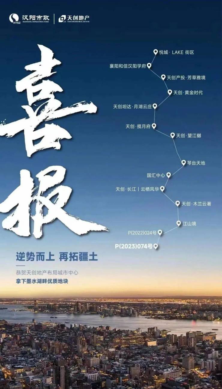 2023年10月19日,武汉市举办国有建设用地使用权公开出让活动,汉阳区国企湖北天创房地产开发有限公司以底价78650万元获得P(2023)074号地块,成交楼面价6500元/㎡。