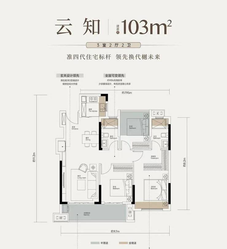 云知户型建面约103平三室两厅两卫:此户型最多,高层两栋楼均有。三开间朝南,功能性最强,可以看出北面的次卧,有着大量的优化面积,不然就只能是个两房加一个书房了。