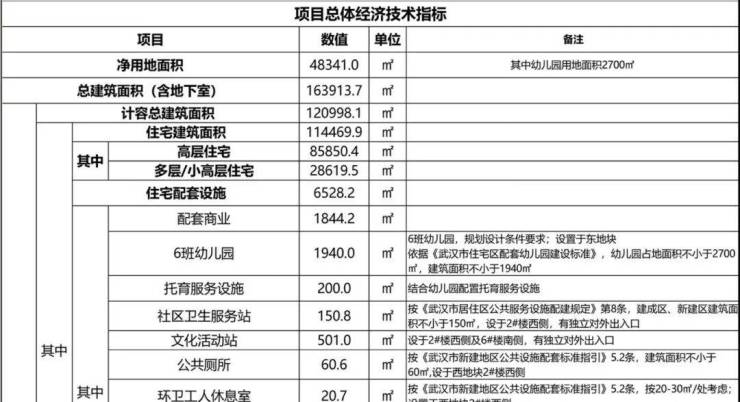 根据规划公示显示,项目净用地面积约4.8万方,总建面约16.4万方,计容总建面约12.1万方,住宅建面约11.4万方,容积率约2.5,户数约1015户,地下机动车停车位约1202个。住宅户均建面约113平,车位配比约1:1.18。