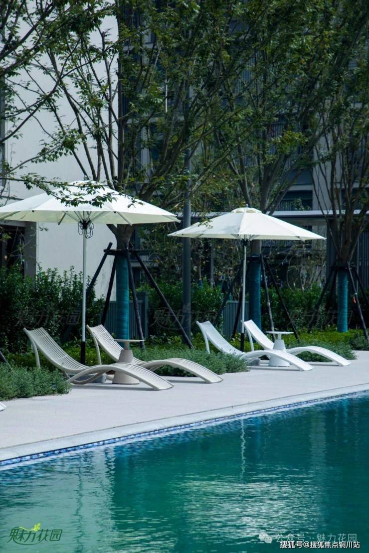 素白的躺椅组合搭配时尚的遮阳伞,于水池旁摆放,增添几许艺术气息