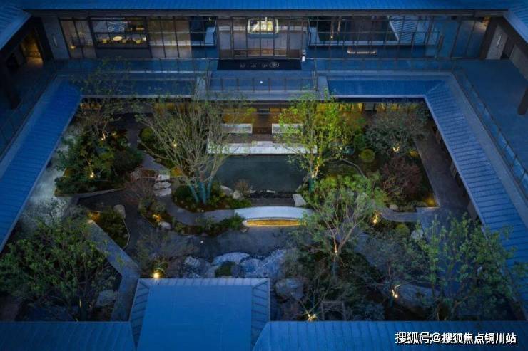 通过刻意抬高的阶梯,正中间千里江山图照壁,和以汉绣编织纹理为灵感、以海棠为元素的格栅和门楼融为一体,最终组成一幅新中式画卷