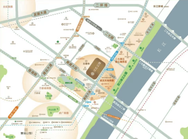 地段优势:位于江岸区汉口滨江商务区板块,属于内环核心地段,距离内环线约 300 米,距离二环线约 1.6 公里,汇聚了丰富的城市资源。