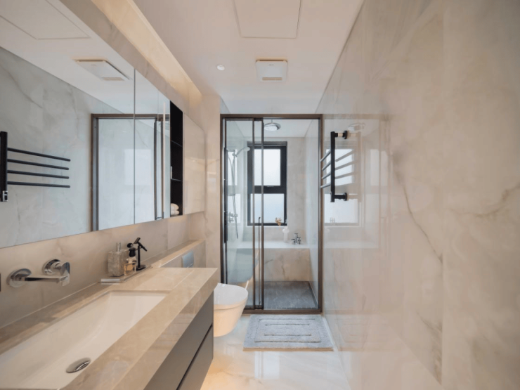 主卧套房设计,自带壁挂式智能马桶、艾芬达电热毛巾架、嵌入式顶喷花洒、美妆冰箱。