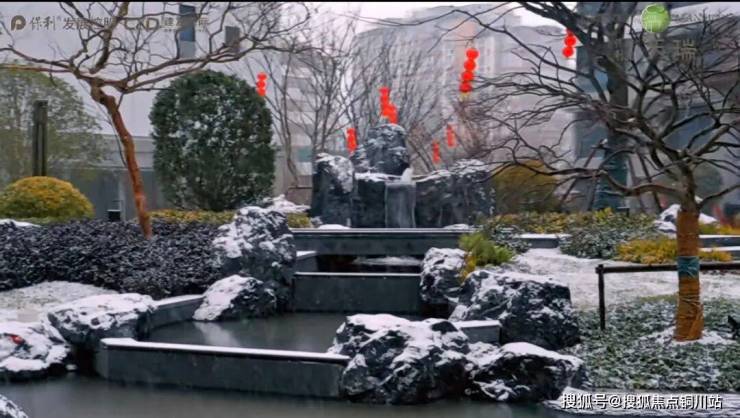 整个社区被大雪裹进了静谧的纯白世界,跌水景观上都被白雪温柔覆盖,只剩中式美学特有的静谧。