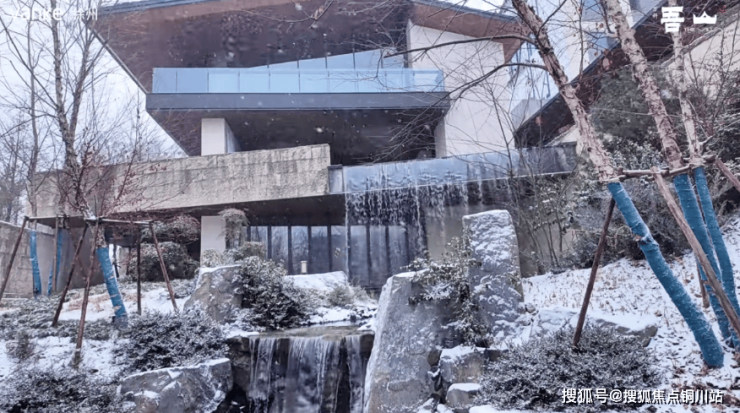 你看小区里飞流的水景,像不像银河落九天?瀑布夹杂着雪花一起落下,伴随潺潺流水声,好一派别致景色。