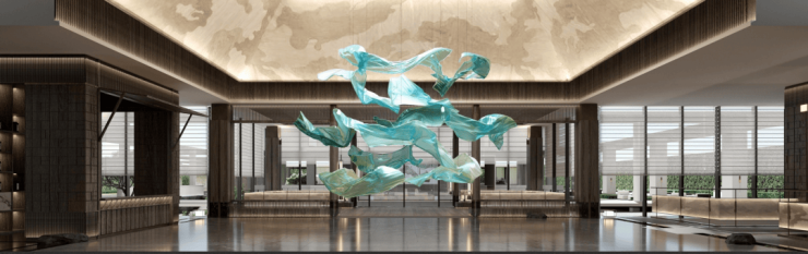 大厅空间布置的艺术装置,通过透光云石、悬浮灯箱等,共同构成灵动的梦幻艺术空间。