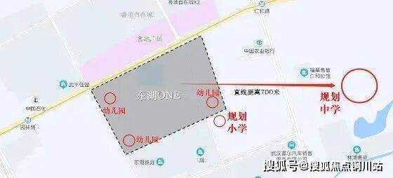 中小学:项目东南方向规划有30班小学,与东湖ONE项目K1地块南面仅一街之隔,同时地块东边规划有中学用地,直线距离约700米,助力社区教育资源。