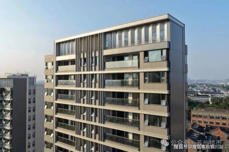 1. 光影为笔,共融古城的天际线:和月泊庭的立面,摒弃繁复,以香槟银、浅灰与木色三色铝板结合玻璃涂料,勾勒出简洁而富有质感的现代轮廓。色彩过渡温和,线条利落干净。傍晚时分,夕阳为建筑披上暖光,转译自苏式披檐与格栅的设计元素,悄然唤醒了“家”的归属感。