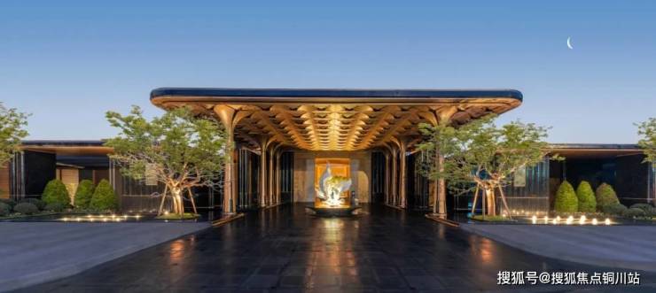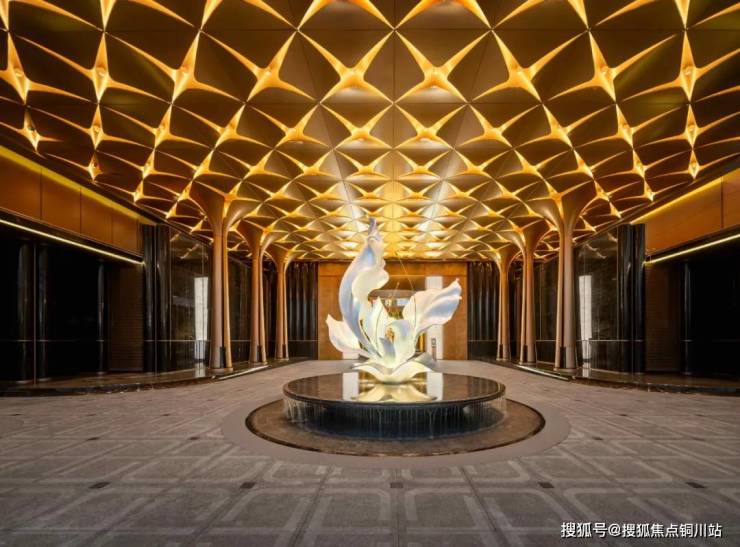 主入口极尽门庭奢礼。全长约42m的超宽门庭,迅速攫住人们的视线。设计提炼百合元素,大尺度雨棚由8根巨型花瓣柱阵列托起,200多片百合花瓣组成的金色吊顶之下百合雕塑熠熠生辉。一扇玉石大门静待开启。