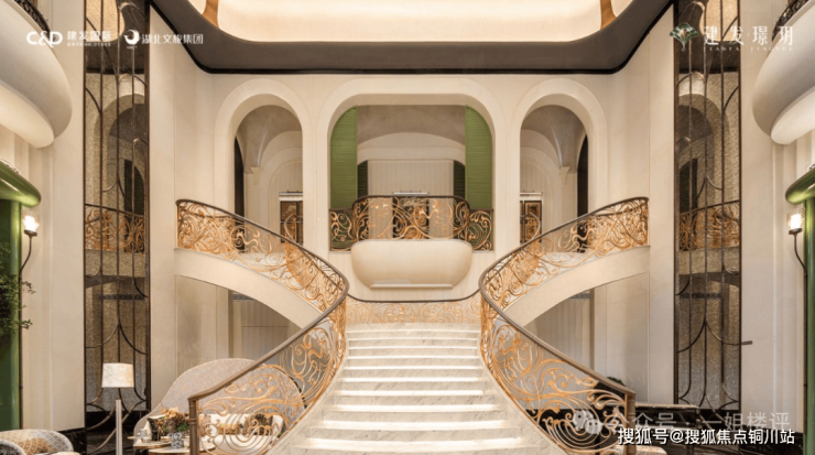 穿过大门就进入了挑高约10米的中庭,这里也是会所的接待大堂,借鉴了厦门千万级豪宅宸启瑞湖的海派美学基因。花瓣式艺术吊灯、南洋釉彩地砖、Art Deco珐琅彩玻璃、双向旋转楼梯......每一处细节,都是对卓越品位的精准表达。