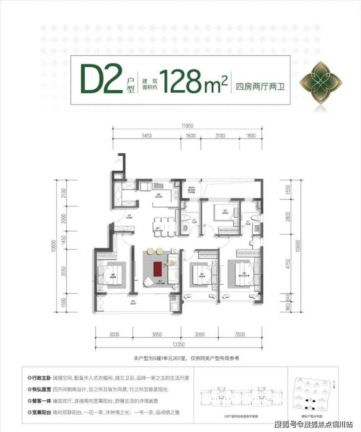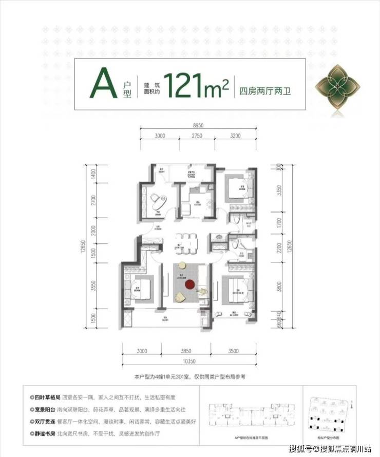 建面约122㎡户型,四开间朝南,市面上少有。宽景阳台+双飘窗的设计,使得南向面宽达近13米。
