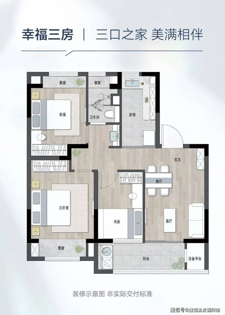 百变灵动格局,通透大横厅可一分为二,随心创变理想三房,从自在独居到三代同堂家庭,皆可随着家庭的不同阶段而进化。
