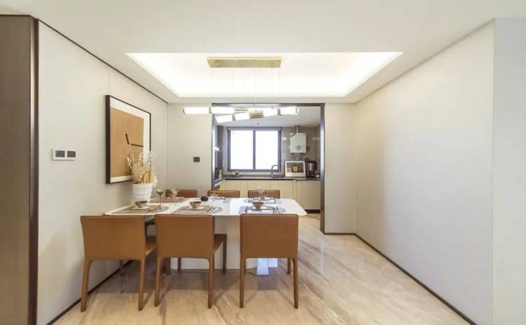 横厅与餐厅、厨房形成「洄游动线」,备餐时能与客厅客人畅谈,用餐后可直接步入阳台赏景,让每个日常瞬间都充满从容气度。