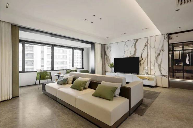 作为家庭的「情感枢纽」,约 5.6 米真横厅以 IMAX 级尺度重新定义社交主场:当阳光透过窗户铺满地面,这里既是先生宴请宾客的「私宴厅」,也是太太举办下午茶会的「茶艺厅」;孩子可以在宽敞地面搭建乐高城堡,老人能在临窗茶台摆弄文竹盆景。