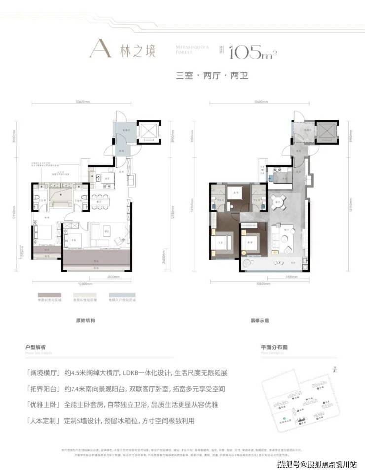 比如说建面约105㎡的三室两厅两卫,南向次卧面宽2.9米,摆下一张2米长的床,还能留出走道空间,并且还是在保留了完整的双跨阳台前提下,计算出来的卧室尺度。也就是说,如果家庭需要更大的卧室,完全可以将南向次卧与阳台打通,形成更大的单元空间。