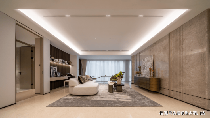 而首层大厅更不用说,尺寸约1.8*3m的整块天然芬迪白石材,直接上墙,地面使用雅柏白内嵌金属线条进行石材拼花,豪宅气场稳稳拿捏。