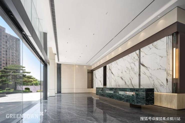 近20米的水系景观,两棵全冠移植的造型松,迎接着家人归家的第一步。归家大堂参照酒店大堂模式,第一级前台check in,第二级前台会客,铺卷开来的仪式感,让回家成为一场优雅的旅行。