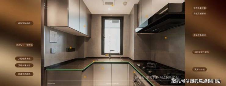 厨房区域,动线井然有序,细节处同样营造游刃有余的下厨体验。灵敏手摇开窗器、超大风量凉霸、厨房安心一键断电、高级定制厨柜、人性化滴水线、格调大面墙砖、防水开关插座、抽拉式便捷水龙头等,多达数十项细节,营造一气呵成的美好烹饪体验,安全从容、洁净清爽,调和出理想厨房的生活馨香。