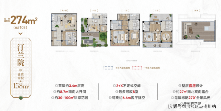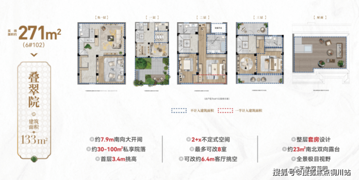 项目充分利用场地宽度,联排产品均为大面宽短进深设计,约7.9米以上南向开间,首层约3.4米层高,客厅纵向挑高约6.4米,提高人居舒适度,是大气场、强身份的象征;地下挑高空间、天地双花园、多星空露台等附赠空间,加倍提升空间利用率,实现了舒适改善与“最多8房布局”功能改善的兼顾,更让中国人向往的“有天有地”院墅生活,有了实现机会。