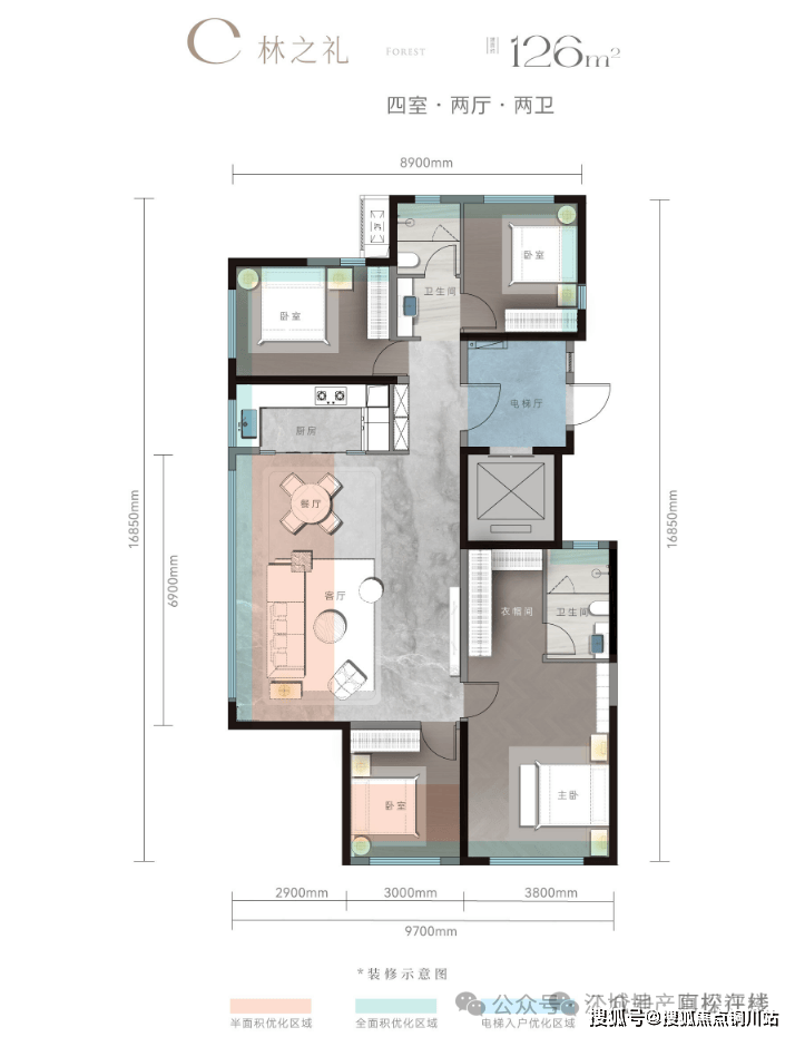 总的来看,建面约126平户型是当前市场上非常少见的,兼具功能性、舒适性、私密性与空间感的超绝设计。
