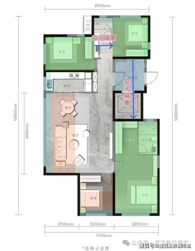 结构布局一绝:主卧与北向次卧之间都有空间隔离,确保家庭成员都有相对独立的空间,实现豪宅式一宅两户的格局,私密性极好。