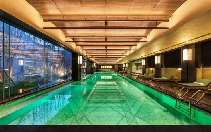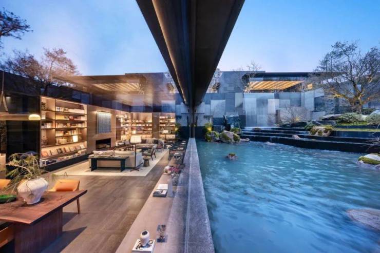 步入到泛会所内部,一块重约4吨、尺寸约14×3.5米的双层超白玻璃映入眼帘,耗时整整3天精心安装,只为营造内外无界的隐逸气韵。曲水流觞的自然景致被巧妙地框入眼前,形成了一种极具张力的美学表达。