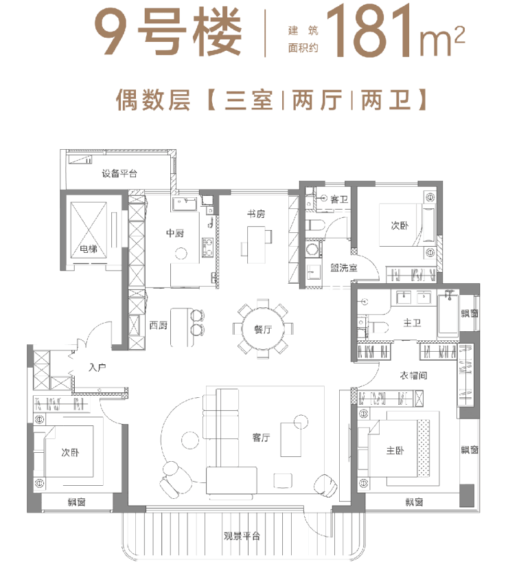 9号楼位于黄金轴线之上,优踞中轴盛境,私享层层递进的归家仪仗,南向近瞰海河畔景致,弥珍风光,加冕主角人生。让海河的四时韵律成为框景于窗的流动诗篇,让生活日常与城市天赋资源相互融合。南北双园环伺,将自然森意织入日常时光,于繁华深处,涵养静谧心境。9号楼全层规划建面约181㎡纯粹大境,构筑同频共鸣的居住场域。