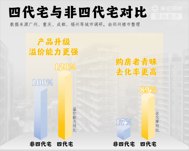 我们将上半年调研一二线城市的四代宅项目和非四代宅项目做了数据对比,可以看出,四代宅项目的溢价能力明显高于传统住宅项目,去化率更是远超非四代宅项目。