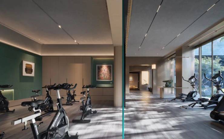 室内包含健身房、瑜伽室、茶室、私宴厅及儿童活动区等功能区,采用回游动线,与景观浑然一体,健身休闲时可以享受天光云影的自然惬意。