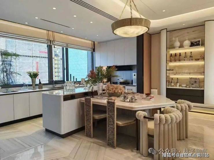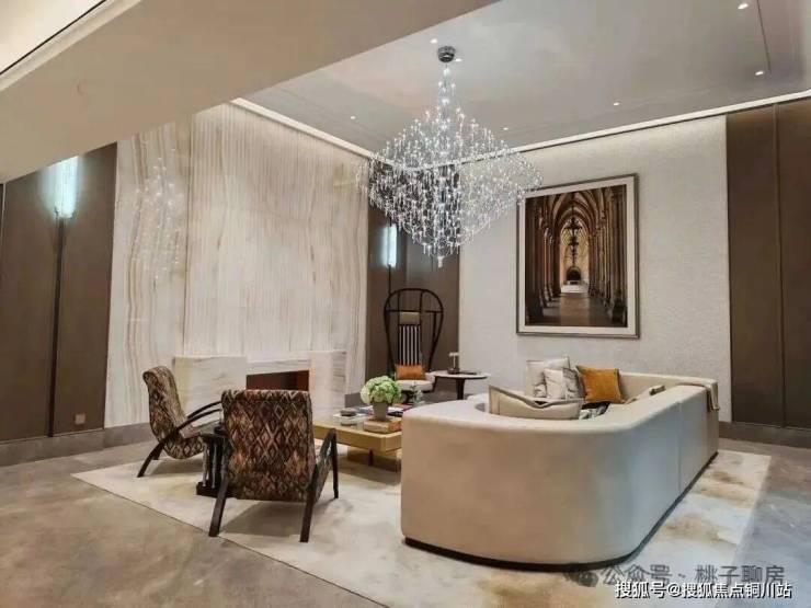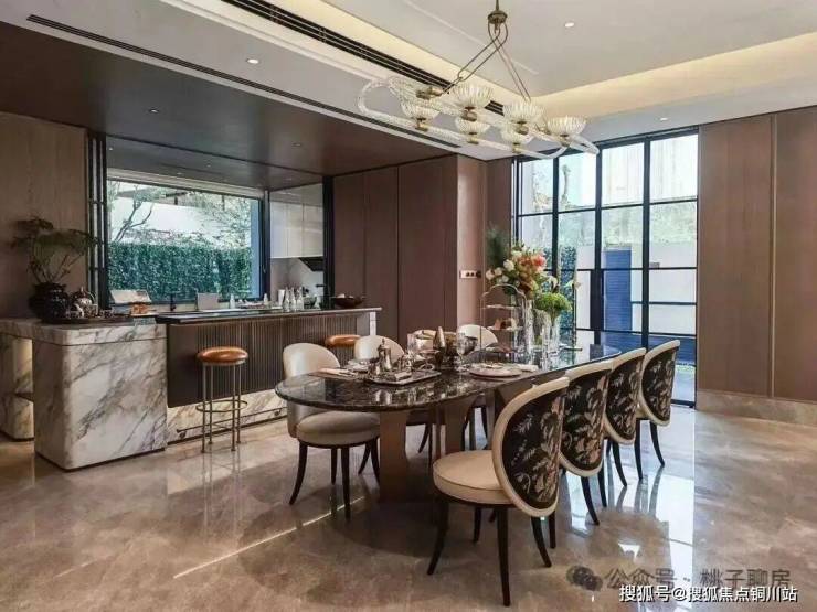 LDKG一体化设计,搭配大面落地玻璃,地面白金沙岩板通铺,吊顶是大通顶,双背景墙采用壁布硬包、帝王翡翠岩板,没有多余的结构墙体,以豪奢尺度构建出家庭交流的超级广域公区。