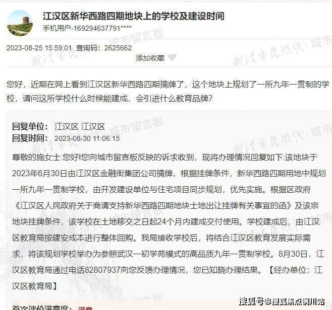 据城市留言板信息显示:新华西路四期用地中含一块教育用地,该规划学校将举办为参照武汉一初学苑模式的高品质九年一贯制学校。