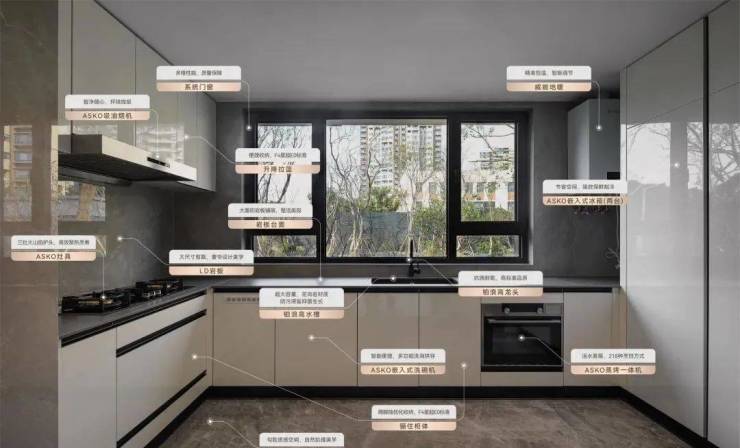 甄选北欧奢品—ASKO厨电六件套,包含灶具、抽油烟机、2台嵌入式冰箱、蒸烤一体机、嵌入式洗碗机,水槽、龙头都是用的德国铂浪高,还有骊住柜体、LD大尺寸岩板、升降拉篮...全方位提升生活品质。