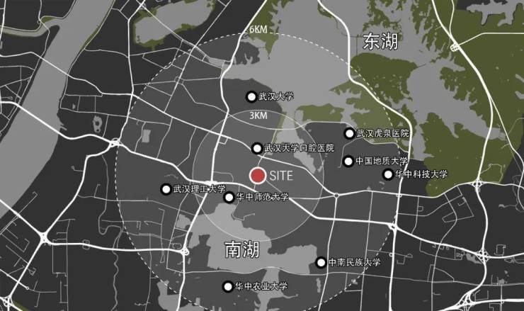 项目地块位于武汉市中心的洪山区,交通便利,周边商业与医疗设施完善。北接东湖旅游度假区,南邻南湖水域,毗邻多所高校,教育资源丰富,为这一地块赋予了独特的人文气息与自然景观的双重价值。