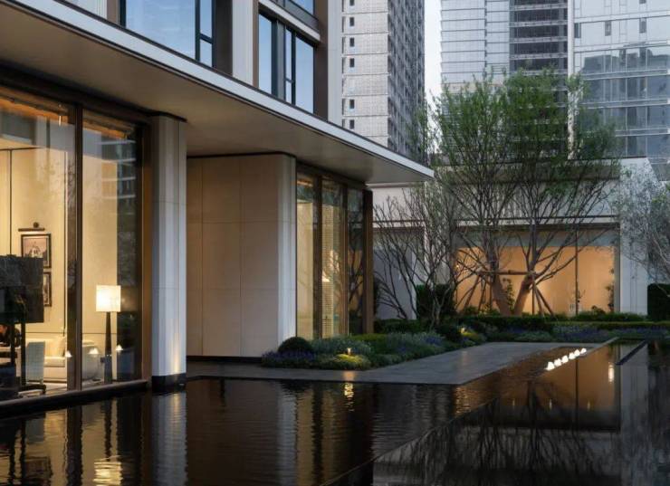步入园区之后扑面而来的是度假感,水院围合出的一方天地让繁华与宁静在此转身,浓荫下是盈润流水,拂拭城市的喧嚣,让回家的心情在这里转换。“ 院落式景观、水院、树池、与矮景墙穿插,艺术水院 ”等场景打破建筑与室外的边界,室内外有机渗透,塑造层层递进的舒缓场景。