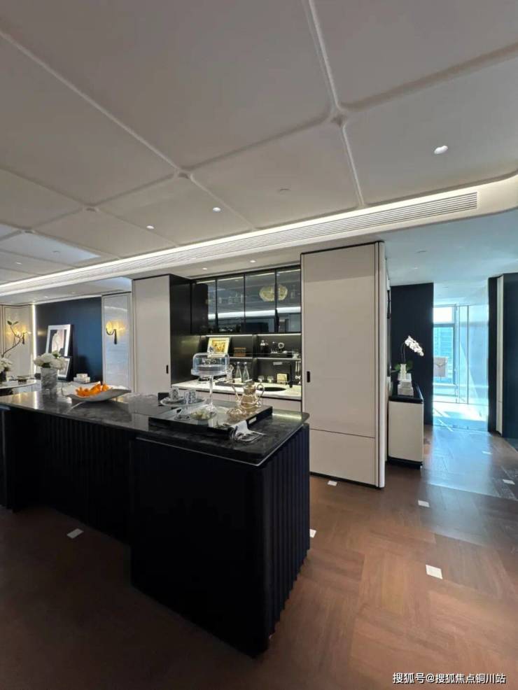 范思哲黑天然石材打造的西厨岛台,是实打实的交付标准。8000元/㎡的装标按5000元计算,相当于直接赠送3000元/㎡的装修红利。圆弧转角设计避免磕碰,隐形电磁炉、博士红酒柜与6个收纳抽屉暗藏实用巧思;BV材质柜门后藏着冰箱,蝴蝶门内则是蒸箱、烤箱、暖碟机,用完推回不占空间,让烹饪成为一种享受。